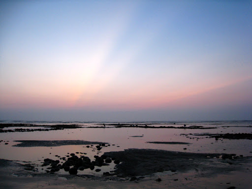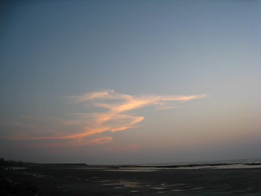 那天傍晚走在白沙屯潮間帶上,本來退去的潮水已逐漸湧上,走到最後雙腳可以感受到海水透過鞋子傳了涼度上來,忙著挖石蚵和苦螺仔的老婦提著裝滿漁獲的水桶,正踩著暮色往家的方向前進。夕陽已完全沒入雲層,卻不甘就此消失,隱身在雲後,透出層層不同色彩的光暈。藍紫色的天空於是泛著淺紫、橘紅、黃澄,還有隱約而現穿越天際的帶狀雲帶,我駐足在此,按下了相機的快門,在心中記下這一刻的美景。
